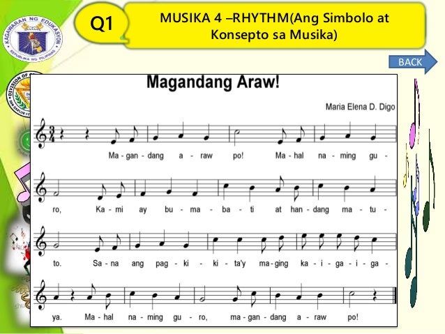 Kasabay nang tamang ehersisyo ay ang tamang pahinga sa pagbabawas ng. Give 5 composers and its own musival works. Awitin ang Magandang Araw Po.