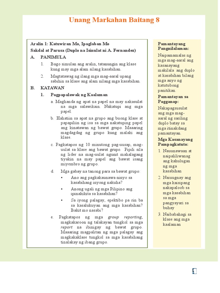 Unang Markahan Baitang 8 Supplemental Lesson Plan Unang Markahan Baitang 8 Supplemental Lesson Plan 1 Aralin 1 Katuwiran Mo Ipaglaban Mo Sakdal At Parusa Duplo Na Isinulat Ni A