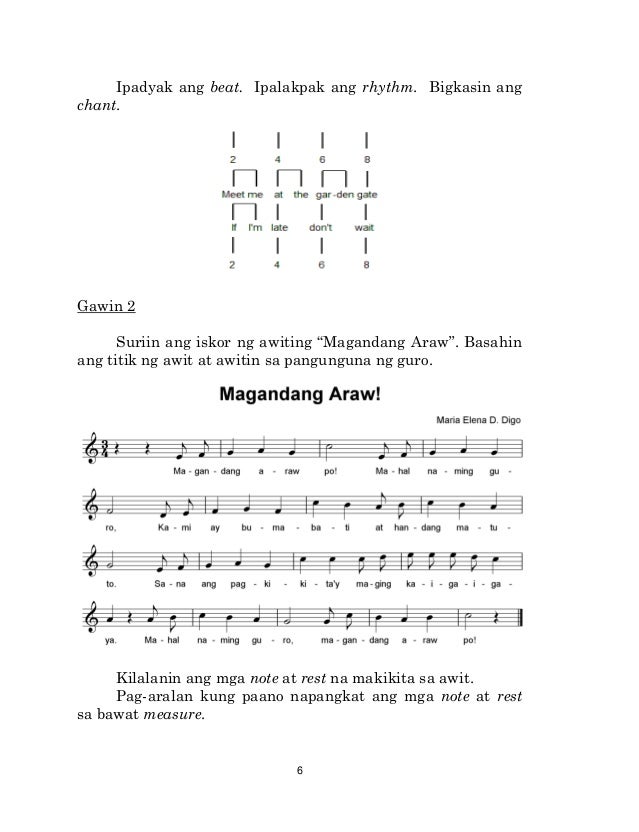 Mga nota at pahinga sa kantang magandang araw. Simbolo at konsepto sa. Batay sa inyong pag- awit aling note ang pinakamahaba ang tunog. Binubuo ng mga nota at pahinga na napapaloob sa dalawang barline at may tamang bilang ng kumpas na naaayon sa nakasaad na meter isang maikling melodic pattern na paulit-ulit na tinutugtog o inaawit kasabay ng pangunahing melodiya pariralang panghimig na nagtataglay ng himig na hinango sa alinmang bahagi ng awit.