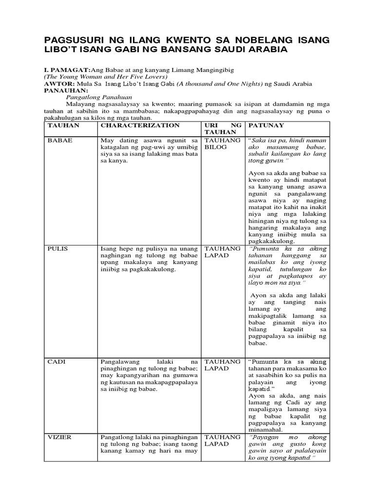 Pagsusuri Ng Ilang Kwento Sa Nobelang Isang Libo At Isang Gabi Docx