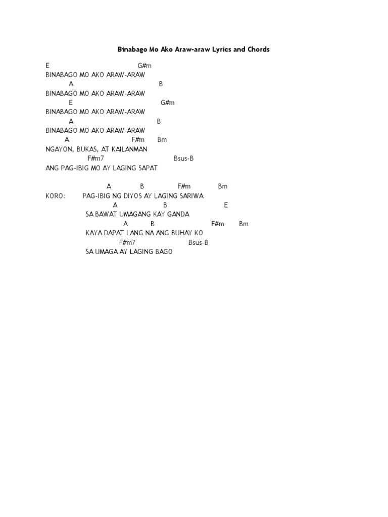 Worship Songs - Various Religions Araw-araw Magpupuri lyrics. Bukod sa araw-araw kita dapat mahalin Pero wag mag-alala kasi hindi ako titigil Kung di ka pa handa di naman ako mainipin Di pa kita pipilitin tuloy-tuloy ko lang to gagawin Na araw araw kita dapat mahalin Araw araw kita love tandaan mo basta wag na wag Mong sasabihin na hanggang dito lang lahat Hindi magrereklamo to kasi hindi pa tayo. Dm7 cm7-fm7 araw-araw magpupuri bm7 e a em7-a7 araw-araw ako ay sasamba-ha DM7 WALANG PAPANTAY SA PAG- C7 IBIG Fm MO Bm7 E A Em - A7 IKAW LANG ANG BUHAY KO.