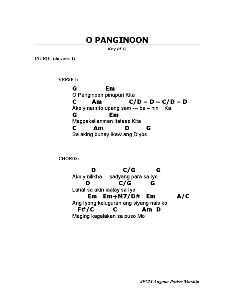 I O kay sarap talagang magpuri sa Iyo Panginoon di na kayang pigili. A Chorus A Cm7 Fm7 Araw-araw magpupuri D E A Araw-araw ako ay sasamba A Cm7 Fm7 Walang papantay sa pag-ibig Mo D E A D E Ikaw lang ang buhay ko Verse 1 A Cm7 O kay sarap talagang magpuri D A sa Iyo Panginoon D Cm7 Fm7 Di na kayang pigilan pa D E D E ang pagdiriwang na nadarama Verse 2 A Cm7 Ikaw lang. Walang papantay sa pag-ibig Mo.