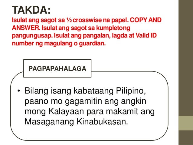 Gamitin sa pangungusap ang mga sumusunod na pangalan. Contextual translation of pangungusap tungkol s araw ng kalayaan. Edukasyon sa Pagpapakatao 28102019 1829.