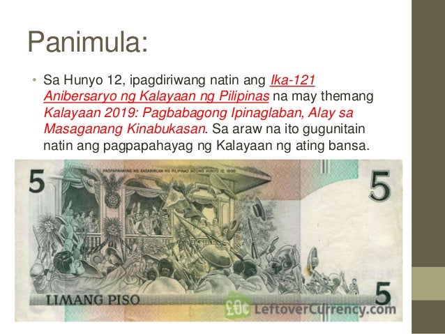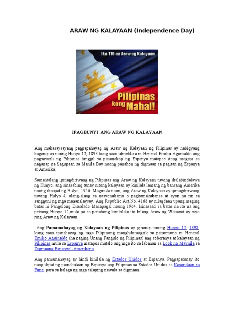 Also known as Araw ng Kalayaan or Day of Freedom in the Philippines is held every 12 June and commemorates the Philippines declaration of independence from Spanish colonial rule. Sumulat ng dagi tungkol sadi. Lagyan ng tuldok sa hulihan kapag Read more.