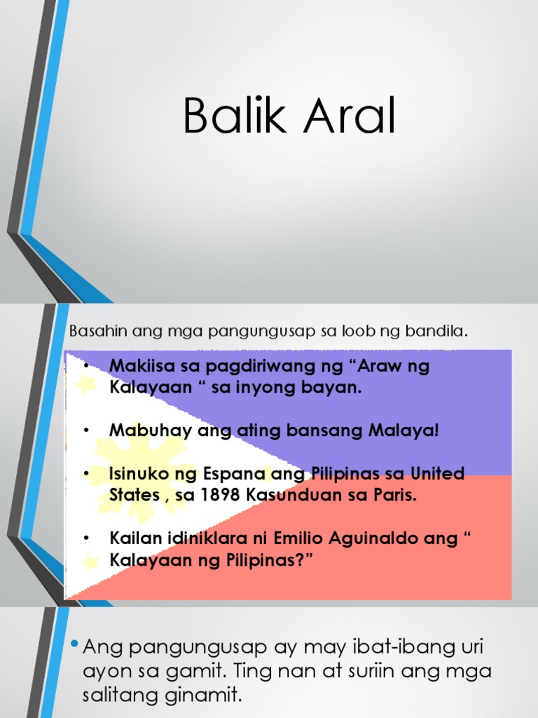 B Dadalo ka ba sa pagpupulong ngayong Huwebes C Naku may sunog. The day is spent with family bonding with friends and relatives and in either outdoor and indoor activities. At ibapa jesskitty jesskitty Ang araw ng kalayaan ay araw ng pag-alala sa kalayaan ng ating bansa.