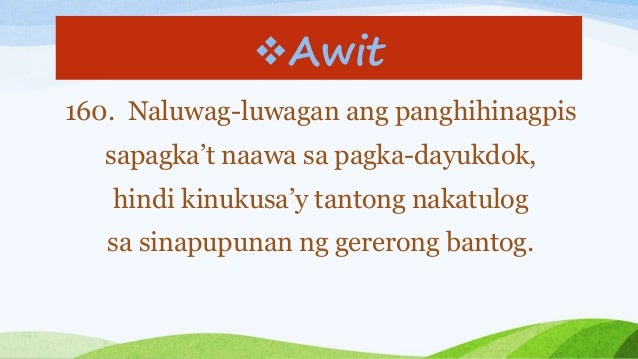 Kapos ang dila kong magsaysay ng laki ng. 14022018 Kaya nang isabog sa sansinukuban ang doradong buhok ng masayang Araw nagbagong hinahot pinasalamatan sa langit ang bagong lakas ng katawan 18. Hinanap niya ang kasintahan sa gitna ng kahabag-habag na kalagayan.